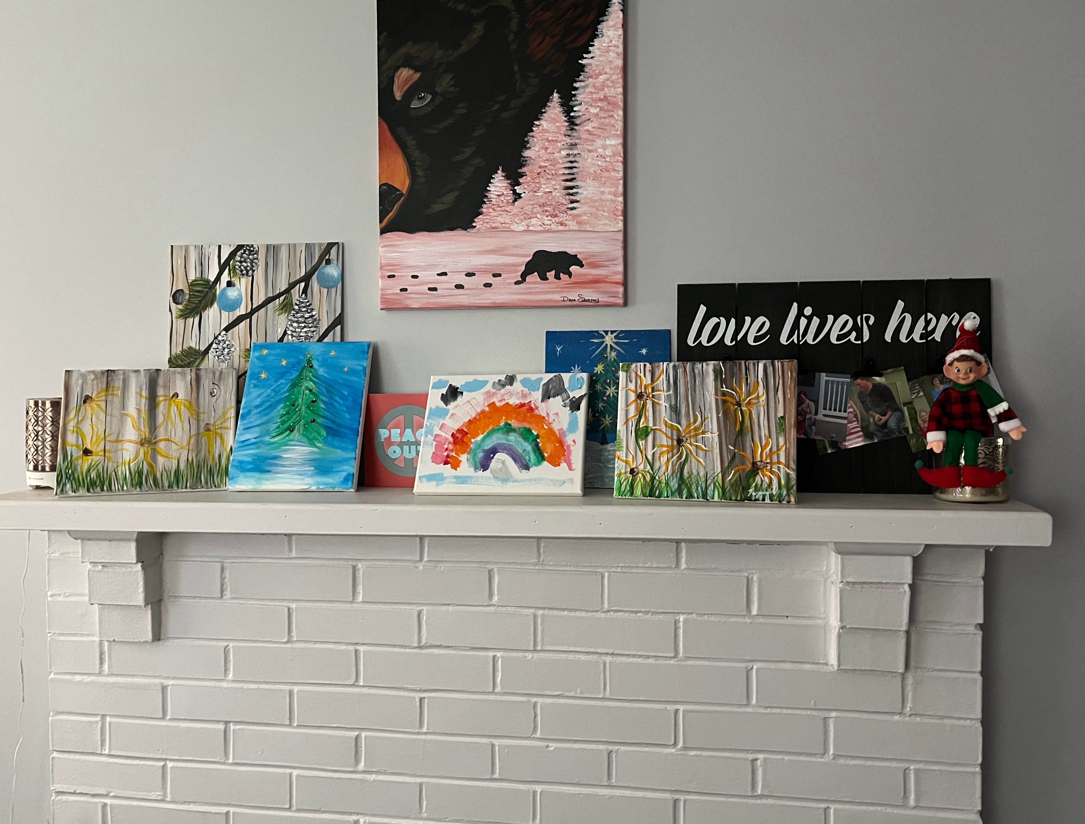 The four paintings in the front – the flowers, Christmas tree, and rainbow – are our paintings from December 2022. The two flower paintings are my oldest granddaughter’s (on the left) and mine (on the right). The Christmas tree was painted by the middle granddaughter, and the rainbow by the youngest. We had a a great time continuing our tradition and they all remain excited and thoughtful about their creations.